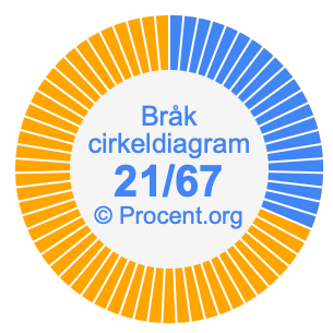 Illustrationerna nedan visar hur 21/67 och 31,34% delar upp ett cirkeldiagram olika men täcker samma område eftersom de är desamma.