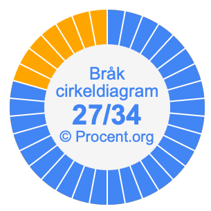 Illustrationerna nedan visar hur 27/34 och 79,41% delar upp ett cirkeldiagram olika men täcker samma område eftersom de är desamma.