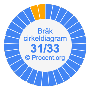 31/33 är ett bråk som betyder 31 av 33, och procent betyder något av 100. Vi kan därför göra följande ekvation för att få 31/33 som procent: