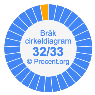 Dessutom kommer vi också att illustrera bråket 32/33 i ett cirkeldiagram och 32/33 som procent i ett cirkeldiagram.