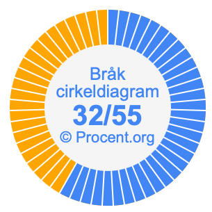 Dessutom kommer vi också att illustrera bråket 32/55 i ett cirkeldiagram och 32/55 som procent i ett cirkeldiagram.