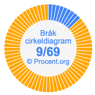 Dessutom kommer vi också att illustrera bråket 9/69 i ett cirkeldiagram och 9/69 som procent i ett cirkeldiagram.