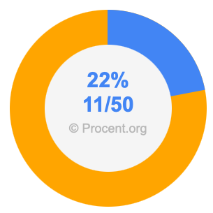 Den följande bilden visar 22 procent och 22 som bråk i ett cirkeldiagram. Som du nu vet, är 22% detsamma som 11/50.