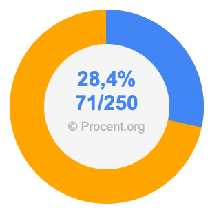Den följande bilden visar 28,4 procent och 28,4 som bråk i ett cirkeldiagram. Som du nu vet, är 28,4% detsamma som 71/250.