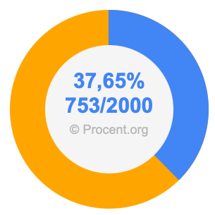 Den följande bilden visar 37,65 procent och 37,65 som bråk i ett cirkeldiagram. Som du nu vet, är 37,65% detsamma som 753/2000.