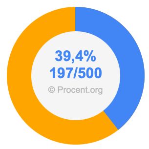 Den följande bilden visar 39,4 procent och 39,4 som bråk i ett cirkeldiagram. Som du nu vet, är 39,4% detsamma som 197/500.