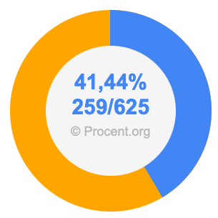 Den följande bilden visar 41,44 procent och 41,44 som bråk i ett cirkeldiagram. Som du nu vet, är 41,44% detsamma som 259/625.