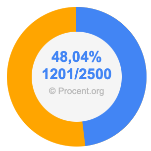 Den följande bilden visar 48,04 procent och 48,04 som bråk i ett cirkeldiagram. Som du nu vet, är 48,04% detsamma som 1201/2500.