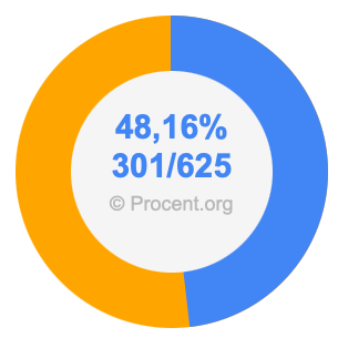 Den följande bilden visar 48,16 procent och 48,16 som bråk i ett cirkeldiagram. Som du nu vet, är 48,16% detsamma som 301/625.