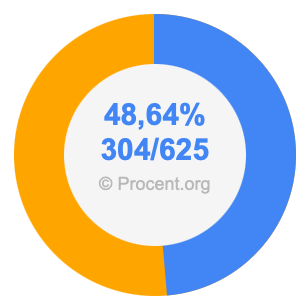 Den följande bilden visar 48,64 procent och 48,64 som bråk i ett cirkeldiagram. Som du nu vet, är 48,64% detsamma som 304/625.