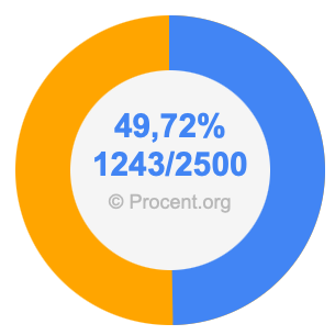 Den följande bilden visar 49,72 procent och 49,72 som bråk i ett cirkeldiagram. Som du nu vet, är 49,72% detsamma som 1243/2500.