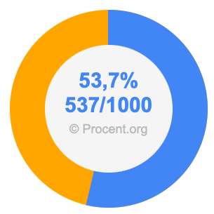 Den följande bilden visar 53,7 procent och 53,7 som bråk i ett cirkeldiagram. Som du nu vet, är 53,7% detsamma som 537/1000.