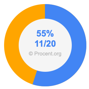 Den följande bilden visar 55 procent och 55 som bråk i ett cirkeldiagram. Som du nu vet, är 55% detsamma som 11/20.