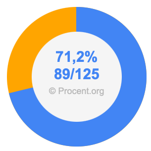 Den följande bilden visar 71,2 procent och 71,2 som bråk i ett cirkeldiagram. Som du nu vet, är 71,2% detsamma som 89/125.
